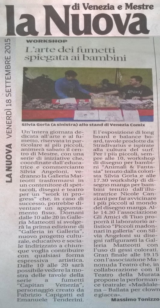 Inoltre per tutta la giornata sarà possibile vedere mostra delle tavole della serie a fumetti “Capitan Venezia”, personaggio creato dallo sceneggiatore Fabrizio Capigatti assieme al disegnatore Emanuele Tenderini. Nella “cornice” della Galleria Matteotti verranno esposte tavole originali, studi di caratterizzazione dei personaggi e le copertine inchiostrate della miniserie dedicata al supereroe veneziano.