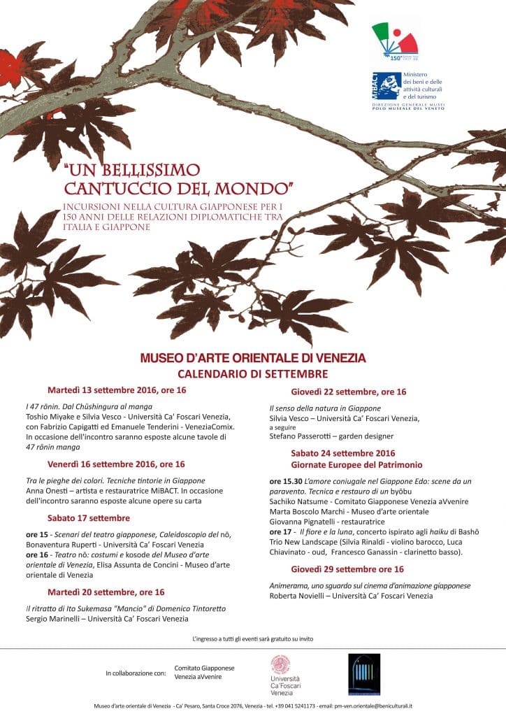 In occasione della rassegna di approfondimenti dedicati alla cultura giapponese “Un bellissimo cantuccio del mondo”. Incursioni nella cultura giapponese per i 150 anni delle relazioni diplomatiche tra Italia e Giappone, martedì 13 settembre 2016 alle ore 16 presso il Museo d’Arte Orientale di Venezia si terrà