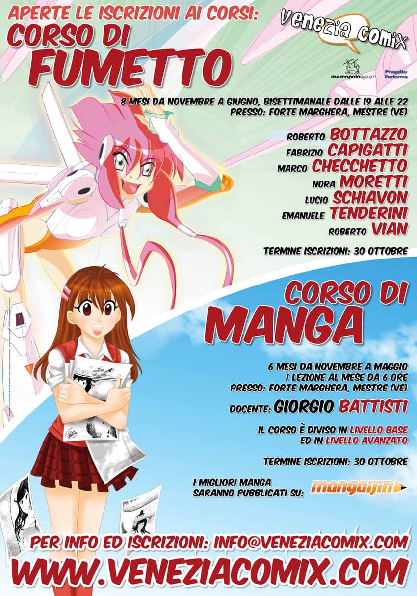 La novità per l’anno 2010-2011 è l’apertura del nuovo CORSO DI MANGA, tenuto da Giorgio Battisti autore di manga conosciuto e apprezzato in Italia. Anche per questo corso viene attivato un LIVELLO BASE ed un LIVELLO AVANZATO in cui verranno anche forniti gli strumenti da disegno originali per creare manga, ordinati direttamente dal Giappone.