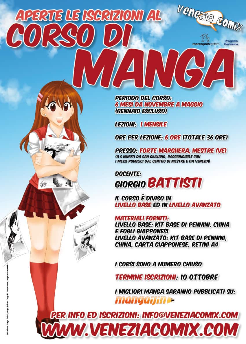 La Scuola del Fumetto di Venezia apre il nuovo Corso di Manga tenuto dal disegnatore manga Giorgio Battisti ed avrà l’importate collaborazione in partnership con www.mangaijin.it che pubblicherà i migliori lavori degli studenti.